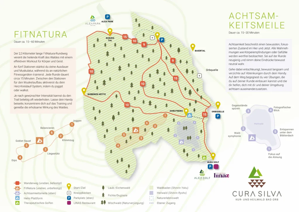 Achtsamkeitsmeile und Fitnessparkour: Der Kurwald der Zukunft entsteht in Bad Orb – und wird auch individuell für Kur, Sport und Regeneration erlebbar. CURA SILVA bietet dafür ideale Voraussetzungen: reine Luft, wohltuende Ruhe und eine außergewöhnliche botanische Diversität. Der einzigartige Bestand klimaresistenter und ökologisch wertvoller alter Eichen und Buchen bildet die natürliche Basis für CURA SILVA.